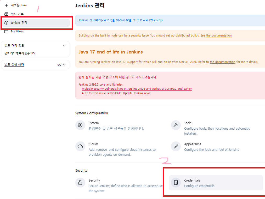 젠킨스에 들어와서 [jenkins 관리] 탭에서 [Credentials]를 클릭해 준다.