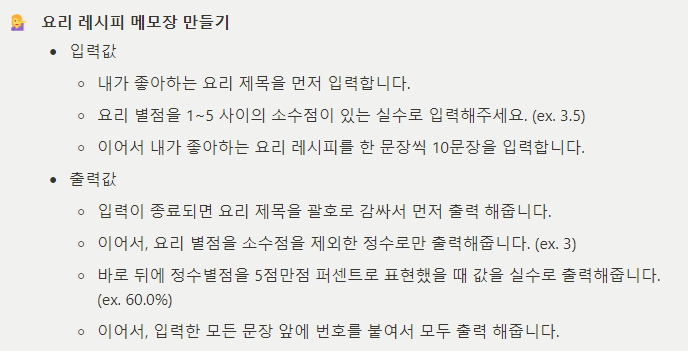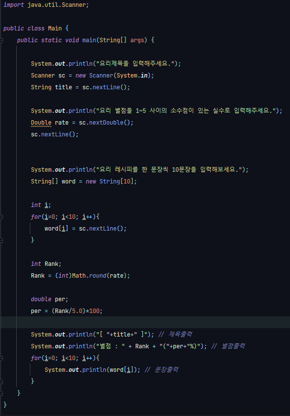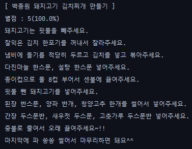 요구사항과 다른 점은 요리별점을 출력하는 부분에서 예시는 버림을 했지만 나는 반올림을 하여서 사용하였다는 것이다.