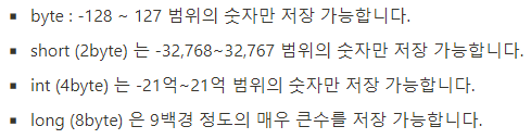 기본적인 정수형 변수의 범위이다. 자주 접해도 헷갈릴 수 있는 부분인 것 같아서 자주 보면서 익숙해져야겠다.