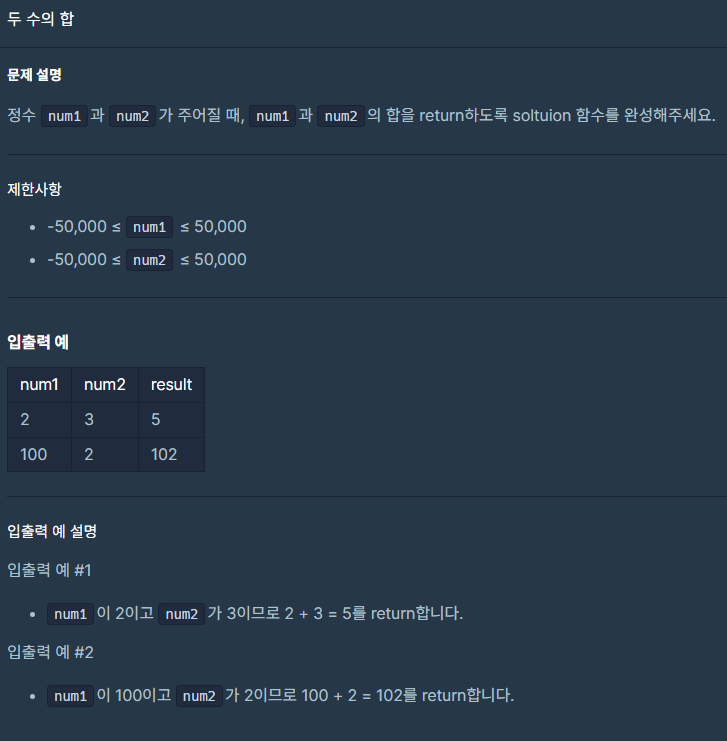 두 매개변수 num1, num2를 더 해준 뒤 answer에 저장하고 리턴해주었다.