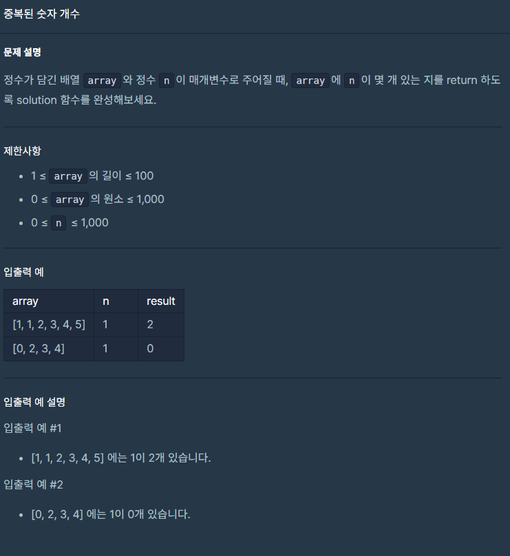for문으로 i는 0부터 array의 배열길이만큼 반복시킨 뒤 array [i]를 사용해서 배열 안에 있는 정수가 매개변수로 받은 n과 일치할 시 answer값을 ++해주었다. 그 후 anwer값을 반환해 주고 종료시켰다.