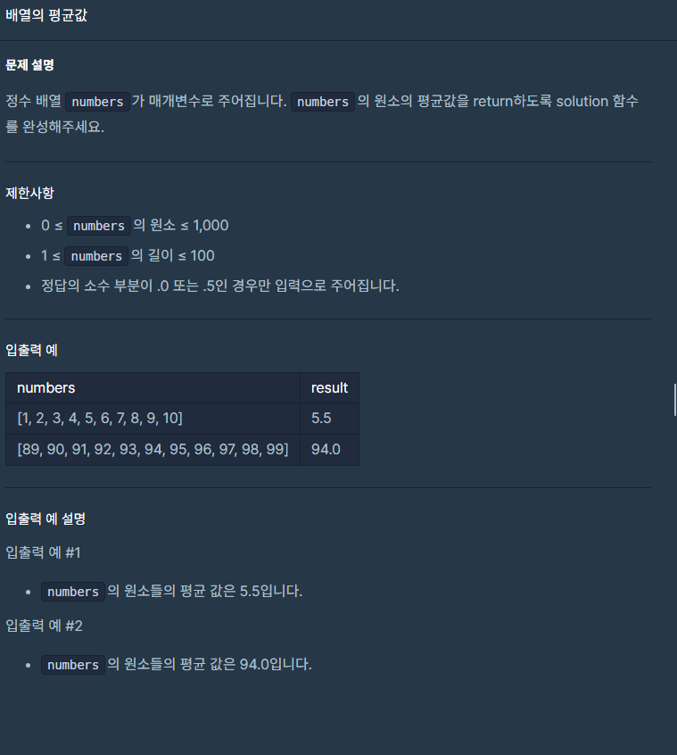 배열의 합으로 사용할 int형 변수 sum을 생성해 주었다. 후에 for문으로 numbers [0] 번째 값부터 마지막값까지 더 해준 뒤 double형으로 정수의 합/배열의 길이를 해주어서 답을 구했다.