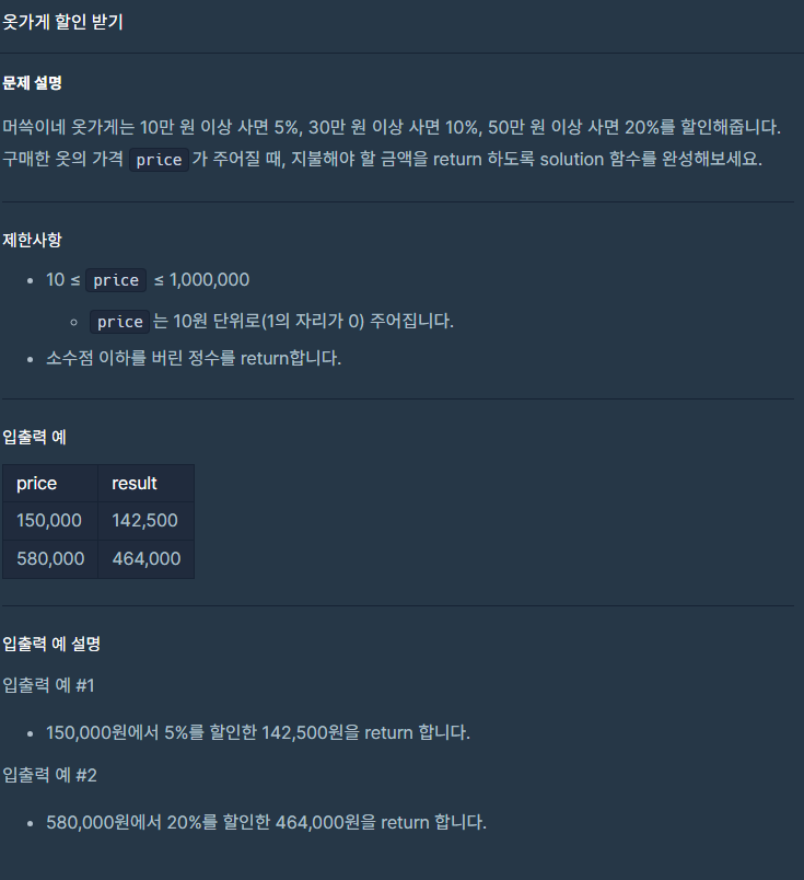 if-else 문으로 풀이하였다. 가격이 50만 원 이상이면 가격의 80 퍼만큼 지불, 30만 원 이상이면 90 퍼만큼 지불, 10만 원 이상이라면 95퍼만큼 지불하도록 하였고 10만원 미만일시에는 물건의 원래 가격만큼 반환하도록 하였다.
