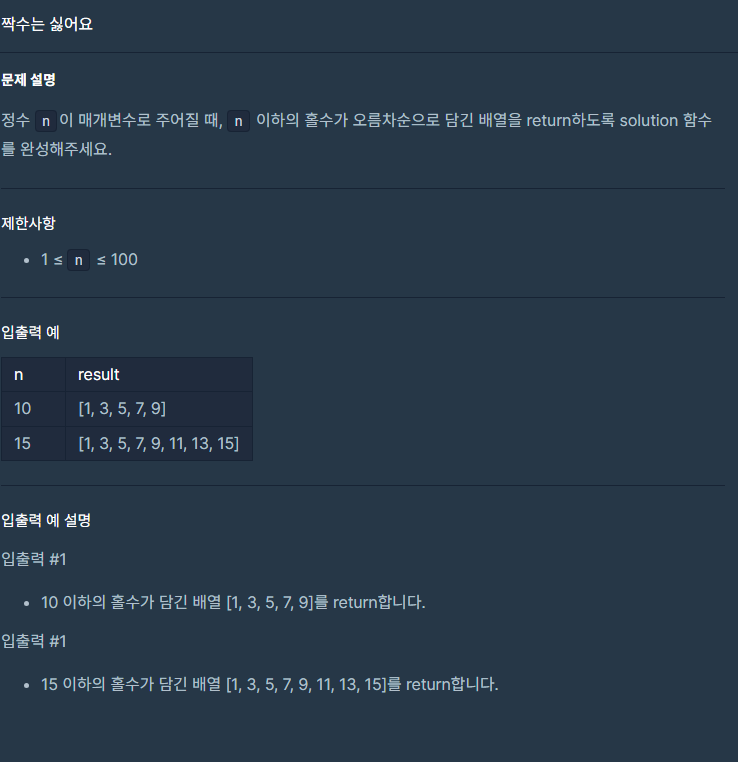 우선 정수형 리스트를 하나 만들어줬다. 그리고 if문에서 홀수들만 남을 수 있게 조건을 걸어주고 배열에 추가되도록 하였다. 반환형이 정해져 있어서 다시 내가 만든 리스트를 배열형태로 바꿔주고 반환하였다.