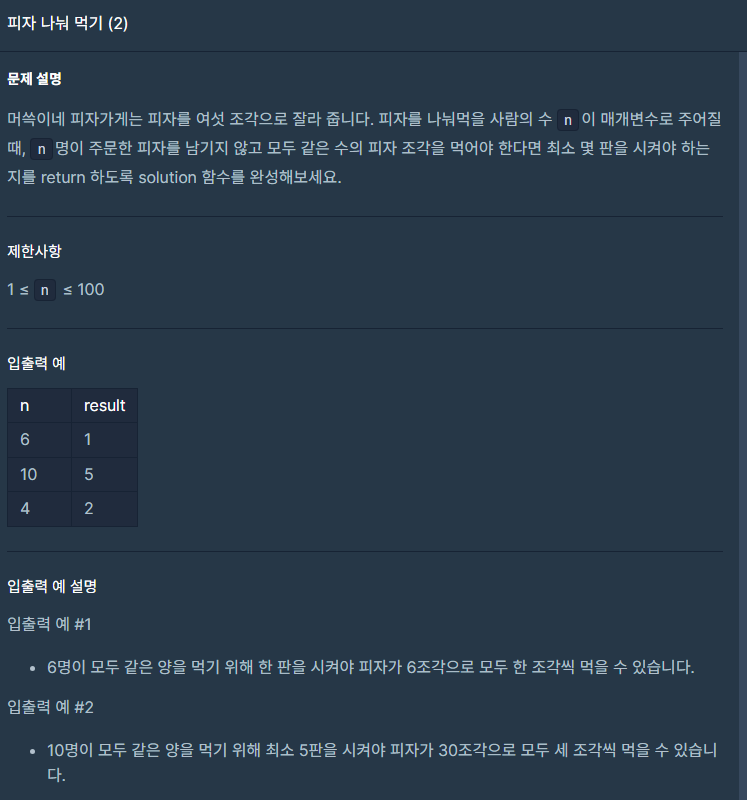 우선 피자가 6조각이기 때문에 num을 6으로 초기화해주었다. 그 후 while문으로 피자조각/인원수를 했을 때 0이 나올 때까지 반복하게 하였다. num에 6을 계속 더해주어서 num% n이 0이 되는 순간 num은 필요한 피자 조각수를 가지고 있을 것이다. 따라서 조각수를 6으로 나눠주면 그게 정답이다.
