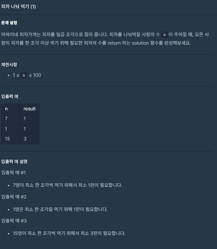 피자는 7조각으로 나눠진다고 가정되었다. 따라서 만약 인원수가 7의 배수이면 피자의 개수를 그대로 넣어주었고, 만약 7의 배수가 아니라면 +=1을 해주어서 1판을 더 추가해 주도록 하였다.