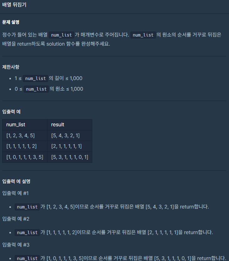 answer의 배열크기는 받아온 num_list의 길이 만큼 지정해주었다. 그 후 i는 0부터 num_list의 길이까지 반복해준다. answer[i] = num_list[num_list.length-i-1]; 에서 -1을 해준이유는 배열의 시작은 0부터 하기 때문에 -1을 해줘서 배열의 끝을 올바르게 설정 해주었다.