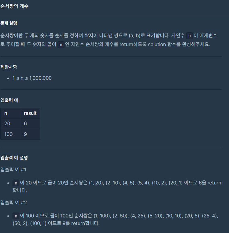 for문으로 범위는 1부터 n번째까지 반복시켰다. n% i == 0을 사용하여 i가 n의 약수일 때 answer에 1을 더해주어 약수의 개수를 구해서 리턴하였다. 약수의 개수만큼 순서쌍이 나온다.