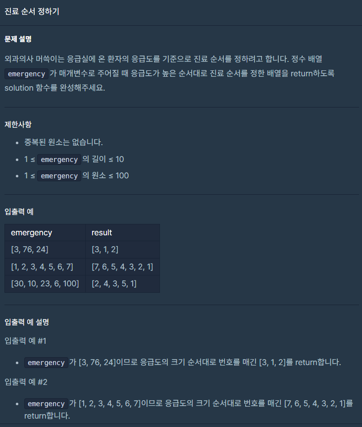 answer 배열의 길이는 emergency의 길이만큼 선언하였다. 그 후 2중 for문을 만들어주었다. for문이 실행될 때마다 cnt의 수를 초기화시켰고 반복해 가며 i번째보다 j번째의 값이 크면 cnt에 1씩 더해줬다. 이렇게 해주면 나보다 응급도가 높은 수의 개수가 나온다. 여기에 +1을 해주어서 순서를 지정해 주었다.