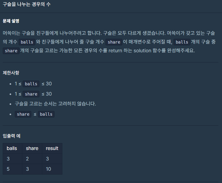 기존에 long형으로 작성을 하였으나 자꾸 특정 테스트 결과가 통과가 안 됐다. 생각해 보니 들어올 수 있는 최대경우의 수가 30!인데 30! 은 long형으로도 담을 수가 없었다. 그래서 BigInteger형으로 바꿔서 사용하였다. 공식에다가 그대로 대입만 해주었다. 문제설명이 살짝 아쉬웠던 게 아닌가 싶은 문제였다.
