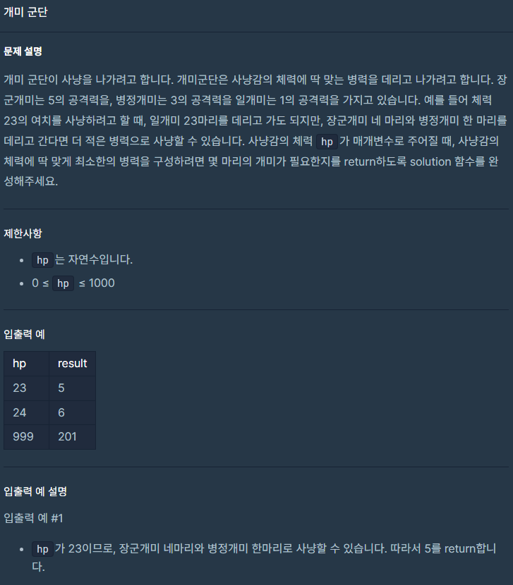 넘겨받은 hp에서 가장 큰 공격력부터 나눠서 필요한 마릿수를 더해갔다. 간단한 문제다.