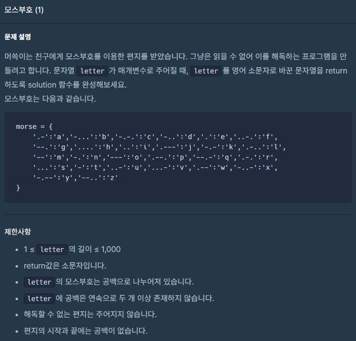 HashMap을 사용해서 제공된 값을 손수 넣어줬다. 후에 letter의 내용을. split(" ")을 사용해서 공백을 기준으로 하나씩 잘라서 대입했다. morse에 get(받아온 알파벳)을 넣어서 모스부호에 맞는 단어를 answer2에 넣어주었다.
