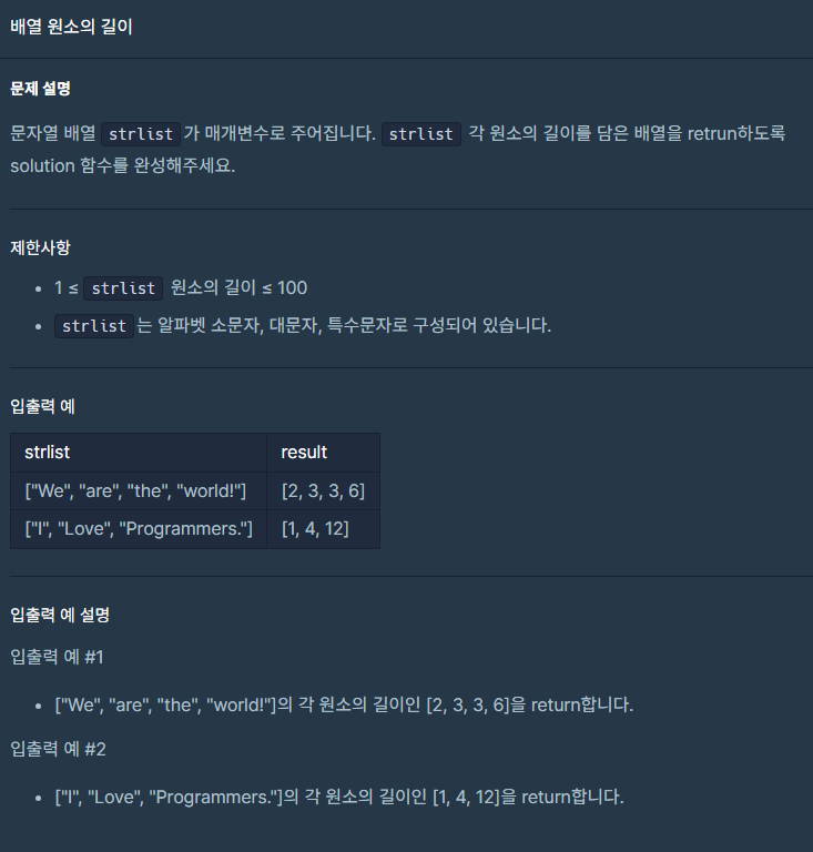 strlist의 원소개수만큼 answer의 길이를 초기화 해줬다. 그리고 반복문으로 0부터 strlist길이까지 반복해 주고 answer [i]에 strlist [i]. length() 즉 각각의 길이를 대입해 줬다. 간단한 문제였다.