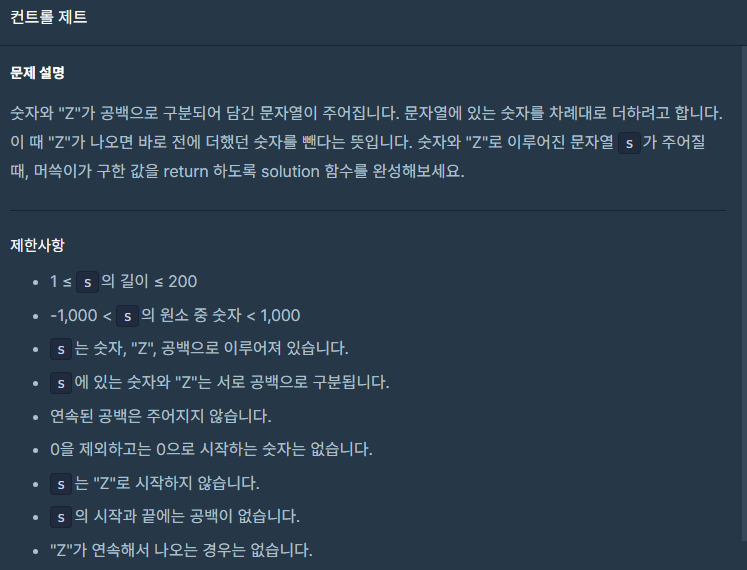 우선 s안에 공백을 기준으로 정렬되어있으니 변수 real에 공백을 기준으로 내용들을 정리하였다. 그 뒤 for문으로 real에 있는 값들을 하나씩 뽑아서 비교했다. 현재 문자열이니 Integer.parseInt()를 사용해서 정수로 변환해 주고 answer에 더해줬다. before에 num을 넣어준 이유는 이전에 더한 값을 저장해 두고 문자열 Z가 나왔을 시 이전에 더한 값을 도로 빼주기 위해서 선언해 줬다.