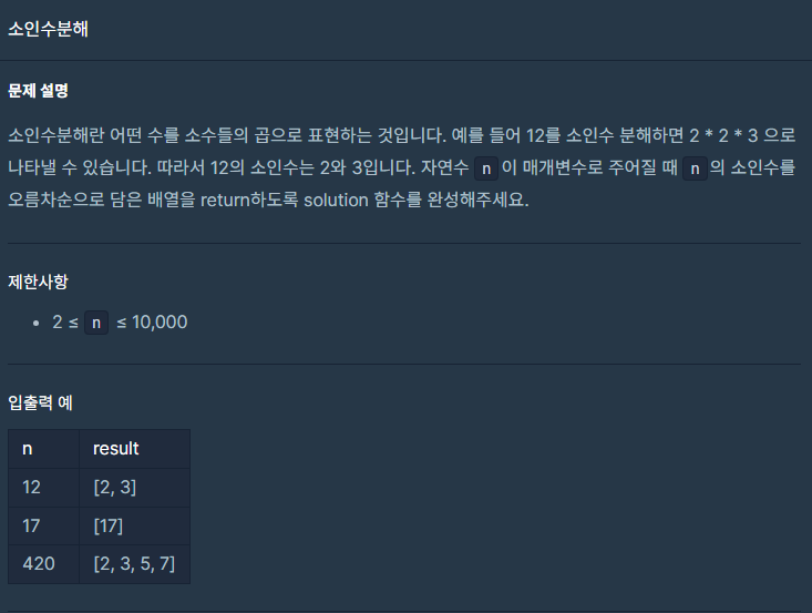 정수를 담을 list를 먼저 선언해줬다. 그 뒤 소인수를 구하기 위해 for문으로 2부터 n까지 반복문을 만들었다. 만약 n을 i로 나눈 값이 0이면 i는 소인수일 것이다. 그리고 while문으로 i가 소인수일 때 n을 n/i로 초기화해주고 list에 추가했다.