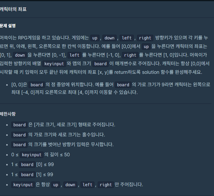 x, y 좌표로 사용할 변수를 먼저 초기화했다. 후에 x, y가 갈수있는 최대의 길이를 담은 x2, y2변수를 만들어줬다. for문으로 keyinput 원소의 개수만큼 반복시켰고, 배열의 문자열이 각각 일치하고 x, y 가 설정된 최댓값, 최솟값을 넘지 않을 때만 x, y에 +, -를 해주었다.