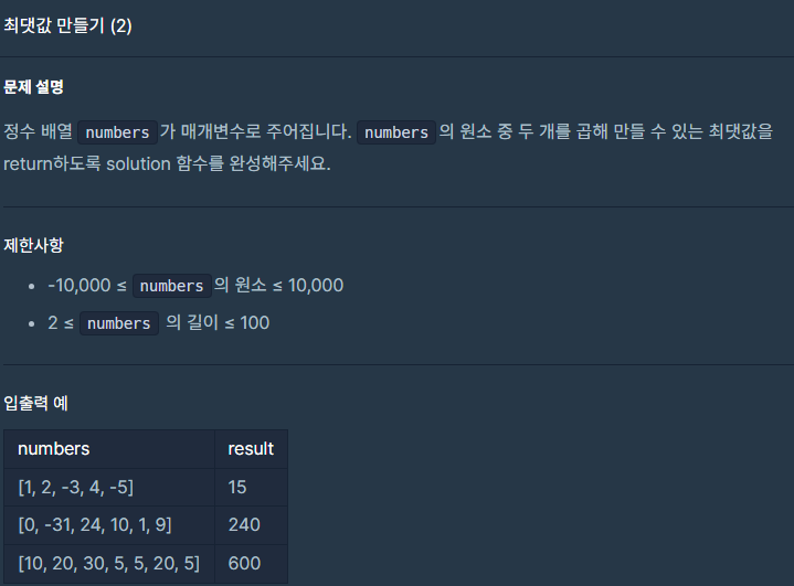 먼저 오름차순 정렬을 시켰다. 그뒤 length에 배열의 길이를 구한 뒤 제일 큰 수 두 개를 곱해서 max에 저장했다. 또한 음수끼리 곱하면 양수가 나올 수 있기 때문에 가장 작은 값도 곱해서 min에 저장했다. 그 뒤 Math.max를 사용해서 두 개 중 크기가 더 큰 값을 answer에 저장하고 반환했다.