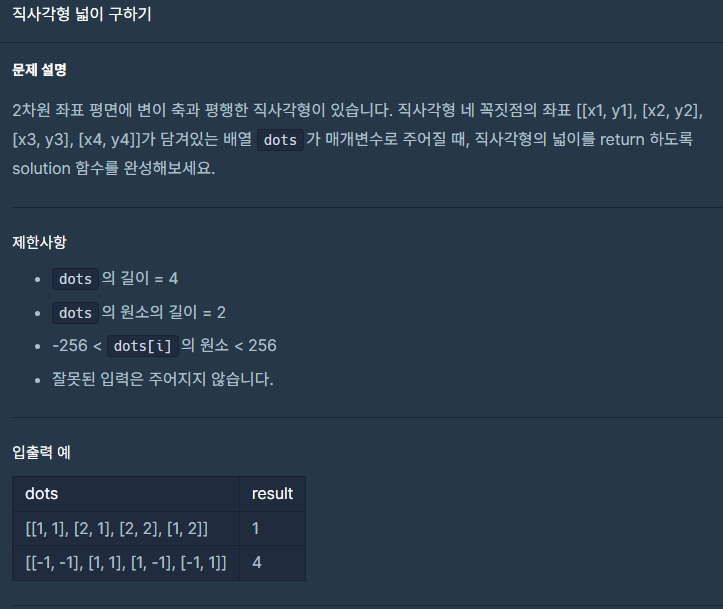 먼저 가로,세로의 값을 담을 변수 w, h를 선언해 줬다. 후에 x에 첫 번째 x좌표값을 넣고, y에도 첫 번째 y좌표값을 넣었다. 그 뒤 1부터 dots의 길이까지 반복을 시켰다. 만약 현재 x좌표와 dot [i][0] 번째 값이 다르다면 좌표의 차이를 구해줬다. 또한 Math.abs를 사용해서 절댓값을 구하도록 하였다. y도 마찬가지로 똑같이 해주었다. w*h를 해주고 반환하였다.