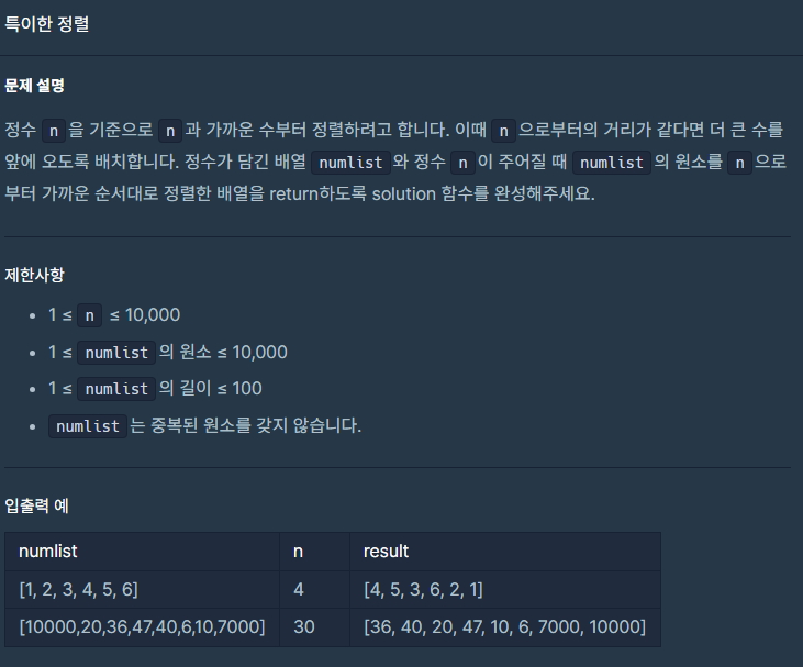 numlist의 길이와 같은 크기를 가진 result배열을 생성했다. 그 후 for문으로 result배열 안에 각원소에서 n을 빼줬다. 그 뒤 Arrays.sort를 사용하여 result을 정렬했다. 그 후 a, b의 절댓값을 A, B에 저장하였다. 만약 절댓값이 같으면 큰 수를 반환하도록 했다. 그 뒤 값을 반환하기 위해 아까 기존값에 n을 더해줬으니 다시 -n을 해주고 배열을 반환하였다.