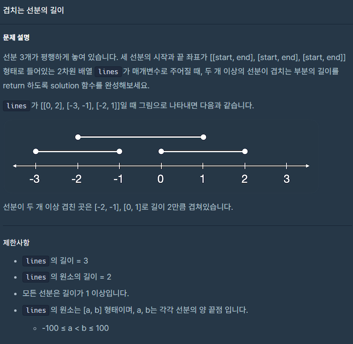 -100 <= a < b <=100 이기 때문에 200의 길이를 가진 정수형 배열을 하나 만들었다. 그 후 lines의 길이만큼 반복시켰고, 시작점 [i][0]부터 끝점 [i][1]까지의 거리를 구했다. +100을 해준 이유는 음수가 나올 수도 있기 때문에 해줬다. 그리고 그 값을 미리 만들어둔 arr [j]에 넣어줬다. 이렇게 하면 시작점과 끝값에 해당하는 원소가 1 증가한다. 그다음 두 번째 for문에서는 겹치는 부분의 길이를 구한다. arr의 길이만큼 반복해 주고 arr [i]에 해당하는 원소가 1보다 크게 되면 answer++를 해준다. 간단히 말하자면 1부터 200까지의 포인트에 각 선이 지나간 곳에 +1을 해준다. 그리고 만약 2번 이상 지나가서 +2가 되어있다면 겹치는 부분이기 때문에 이것들의 개수만 더해줬다.