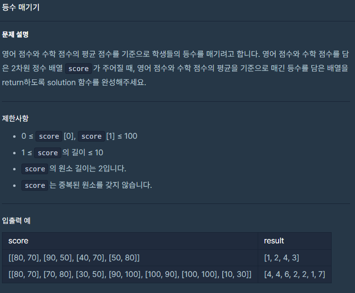 result배열을 생성해서 각 점수의 합을 넣어줬다. 평균을 구하려면 나눠야하지만 어차피 합으로 순위를 구하나 평균으로 순위를 구하나 예외사항은 없다고 생각돼서 결정했다. 합을 result 배열에 차례로 넣어준 뒤 두 번째 중첩 for문에서 순위를 정해줬다. rank값을 1로 정해두고 자신보다 큰 수가 있으면 1씩 더해줬다. 그 뒤 answer배열에 rank값을 넣어줘서 반환했다.