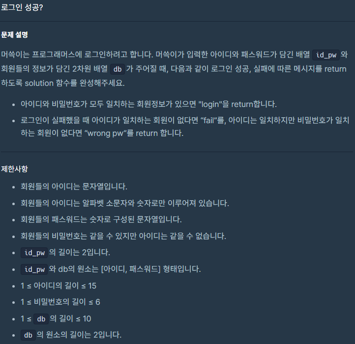 id_pw의 [0]번쨰엔 id가 들어있고 [1] 번째에는 비밀번호가 들어있다. 때문에 첫 번째 for문에서는 id_pw배열 안의 id값과 db의 id값이 일치하는지 찾는다. 또한 일치하면서 pw값까지 같다면 login을 반환해 줬다. 두 번째 for문에서는 id_pw의 첫 번째 값만 확인해 줬다. 바로 return을 안 해줬다면 중복돼서 걸렸겠지만 이미 위에서 return 해줬기 때문에 여기서는 아이디, 비밀번호가 둘 다 일치하는 경우가 없다. 따라서 아이디가 일치하는 게 있으면 wrong pw를 반환해 줬다. 세 번째 for문은 사실 생략하고 초기에 answer에 fail을 선언해 줘도 됐었다. 그래도 나는 일단 작성해 봤다. 생각보다 간단했다.