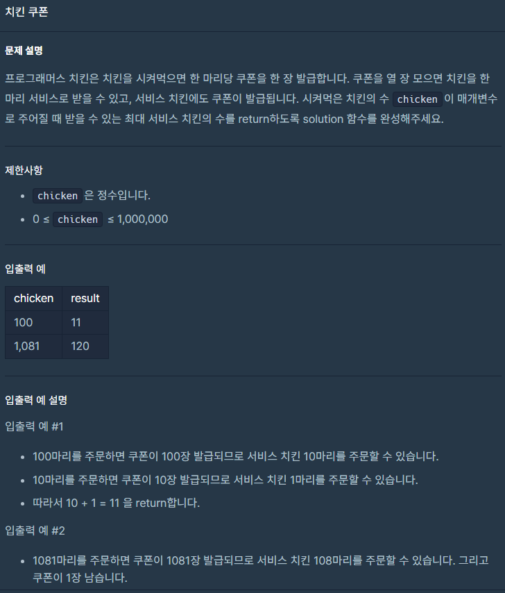 처음에는 for문으로 시도했는데 for문을 무진장 반복해야 끝날 거 같다고 느꼈다. 그래서 빠르게 while문으로 변경했다. 조건은 치킨값이 10마리 이상이면 실행되도록 했다. addchicken에는 초기 서비스 치킨값을 넣어줬다. 그리고 leftChicken에는 10으로 나누고 남은 치킨의 마릿수를 저장했다. 그 뒤 chicken에 서비스 치킨 + 남은 마릿수를 해주고 answer에는 addChicken값만 반복해서 넣어줬다. 풀고 나니 간단해 보이지만 생각하는데 꽤 걸렸다.