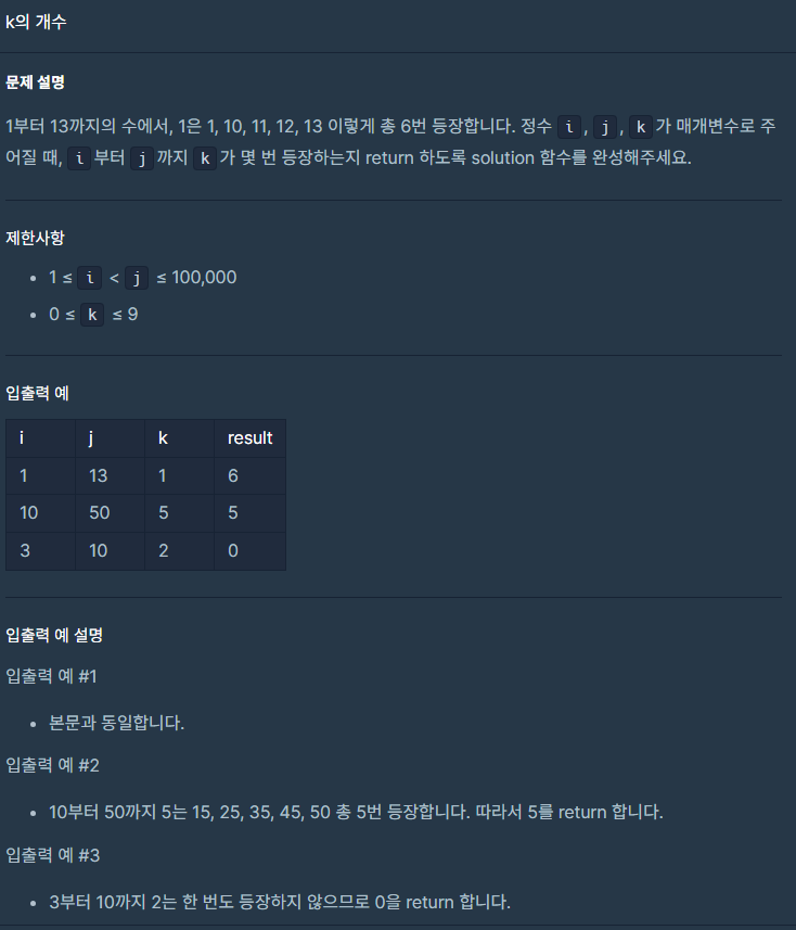 for문을 하나 만들고 i부터 j까지 반복하도록 했다. 그리고 안에 정수 z를 String형태로 변경시켜 줬다. 그 뒤 중첩해서 for문을 하나 더 만들어주고 zz의 각각의 원소를 k와 비교했다. 만약 같으면 answer을 ++ 해줘서 정답을 구했다. Character.getNumericValue는 문자를 정수값으로 나타내는 역할을 한다.