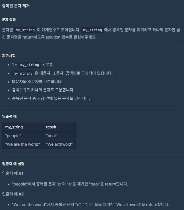 for문을 my_string의 길이에 맞게 반복시켰다. 그리고 if문안에 indexOf를 사용해서 my_string의 각 글자가 처음 등장하는 곳의 위치를 찾는다. 만약 그 위치가 i와 같다면 처음 등장하는 문자이기 때문에 이 경우에만 answer에 추가해 줬다.