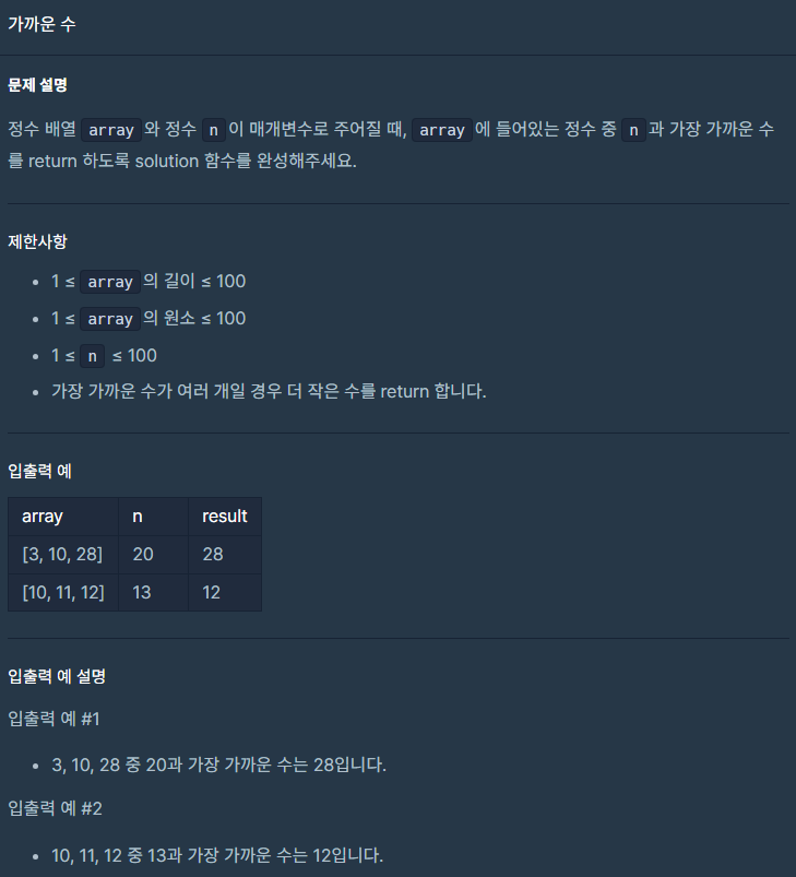 값을 비교하기 위해 answer을 array [0]으로 초기화, 최소 차이를 저장해둘 min에는 array [0] - n을 해준 값의 절댓값을 넣었다. 그리고 for문으로 1부터 전체길이만큼 반복해 줬고 반복문 내의 result는 array [i] -n을 해줬다. 만약 차이가 min보다 result가 더 작거나, 두 개가 같은데 현재 원소가 answer보다 작을 때 작은 값을 반환해야 하니 이경우에도 answer, min의 값을 재설정해주었다. 금방 풀었다고 생각했는데 제출 시 5번 테스트케이스에서 자꾸 오류가 떴다. 생각해 보니 같은 경우를 처리를 안 해줬다. 그래서 시간이 생각보다 오래 걸렸던 것 같다.