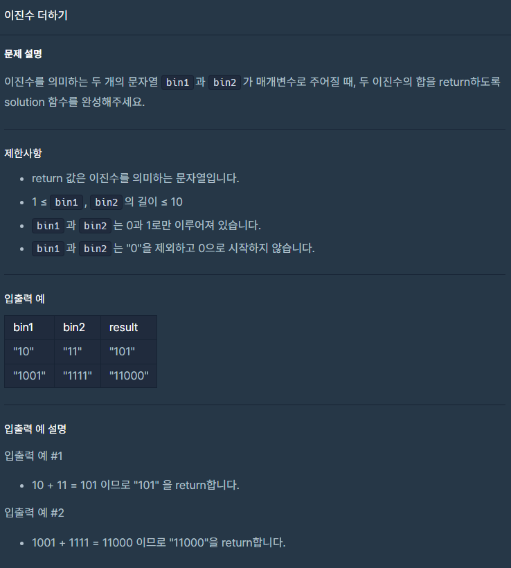 우선 받아온 2진수 두 개를 10진수로 변환해 줬다. Integer.parseInt(a,2)를 사용해서 2진수 a를 10진수로 바꾸도록 설정했다. 그 후 더해진 값을 10진수인 상태에서 더해주고 다시 2진수로 바꿔주었다.