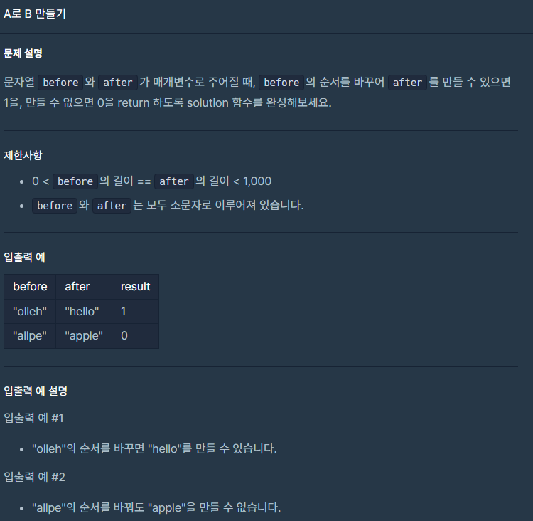 우선 두 String형 변수들을 char형으로 변환시켰다. 그 후 Arrays.sort를 사용해서 정렬시켜 준 뒤 배열을 비교하도록 Arrays.equals을 사용하여 만약 같다면 answer에 1을 대입해 주고 아니라면 그대로 0을 반환한다.