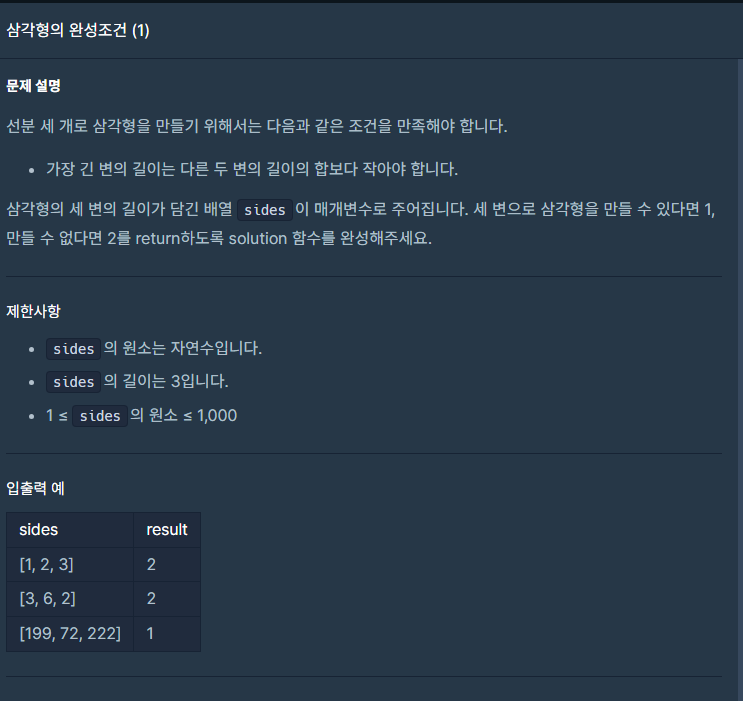 answer의 기본값을 2로 지정했다. 그리고 Arrays.sort를 사용해서 sides를 오름차순으로 정렬해 준 뒤 제일 큰 [2] 값이 [0]+[1]보다 작은지 체크한다. 만약 작으면 삼각형을 만들 수 있으니 answer에 1을 넣어주었다. 만약 if에 걸리지 않는다면 그대로 2를 반환한다.