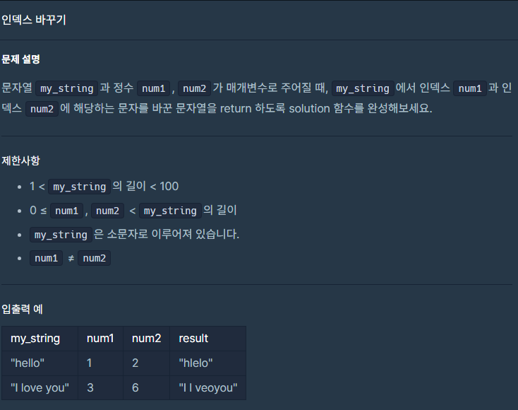 for문으로 my_string의 길이까지 반복해 주고 만약 i가 num1이랑 같으면 num2번째에 있는 값을 넣어주고 i가 num2랑 같으면 num1번째에 있는 값을 넣어줬다. 나머지 상황에서는 i번째 값을 그대로 넣어주고 반환하였다.