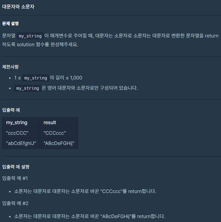 for문으로 my_string의 길이만큼 반복해 줬다. 그리고 변수 ch에 각각의 문자를 넣어주고 범위를 비교하였다. 만약 A~Z 사이이면 answer에 ch+32를 해주고 char형으로 변경뒤 대입했다. my_string에는 소문자와 대문자만 있다고 했으니 else를 사용해서 A~Z가 아니면 ch-32를 해주고 대입해 준 뒤 결과를 반환하였다.