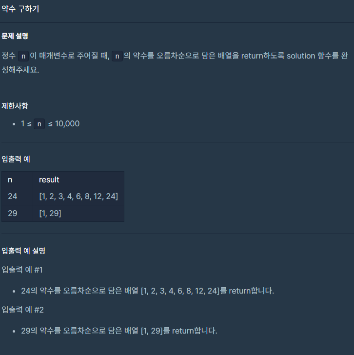 리스트 하나를 생성해 준 뒤에 for문으로 i가 n의 약수일 때 list에 추가해 줬다. 그 뒤 answer의 길이를 list의 길이만큼 생성해 주고 for문으로 그대로 대입해 주고 반환하였다.