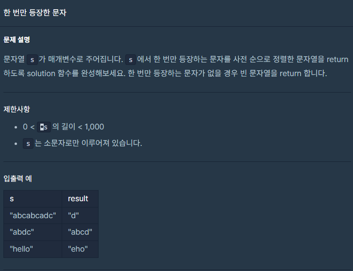 result에 받아온 s를 잘라줬다. 그리고 오름차순으로 정렬 후 반복문을 만들어줬다. 내부 for문에서는 현재값과 다음값이 같은지 체크한다. 만약 같으면 cnt의 카운트가 올라간다. 만약 문자가 1번나왔으면 cnt는 1일 것이다. 그래서 1인값만 answer에 더해주고 반환했다. 간단한 문제였다.