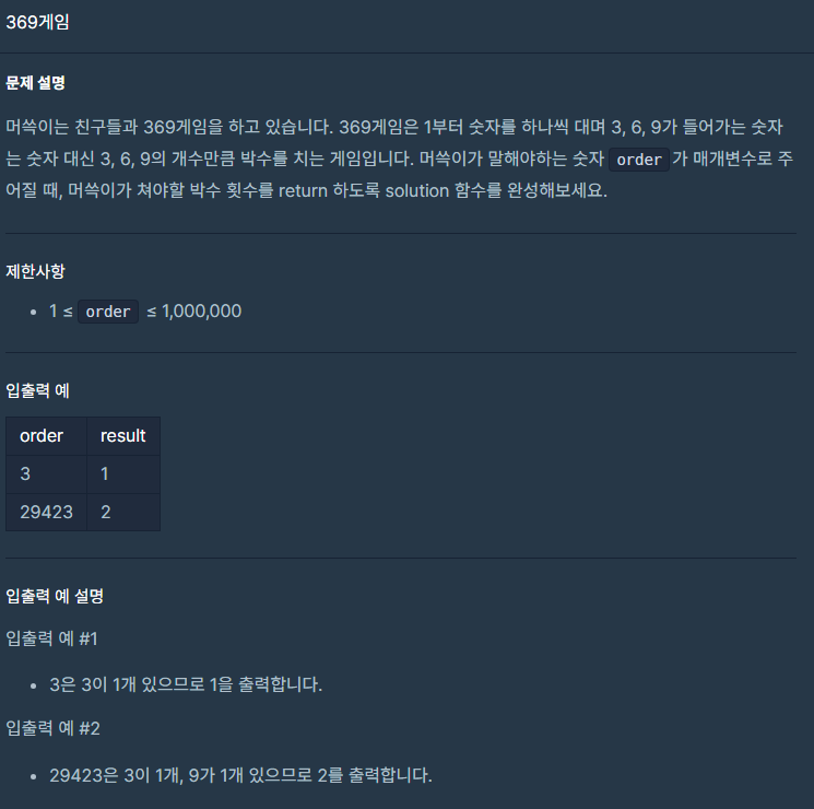 int형 order을 String형으로 변환해 줬다. 그 후 result의 길이만큼 반복하면서 문자열 하나하나를 비교했다. 만약 3, 6, 9 중 하나라도 같은 수가 나오면 answer를 ++ 해줘서 결과를 반환했다.
