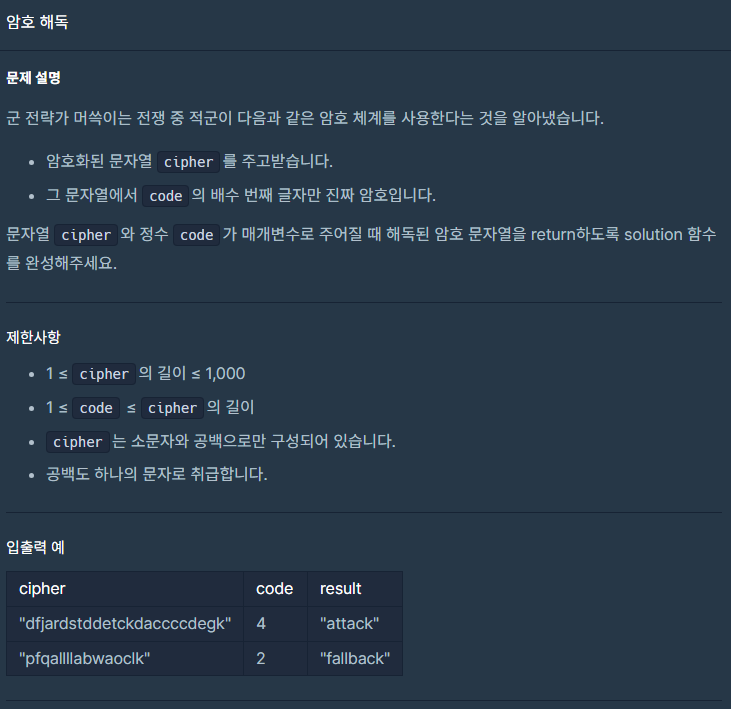 code번째 자리의 배수일때만 가져와야 하기 때문에 code-1부터 시작해서 cipher의 길이까지 반복해 줬다. 그 후 code만큼 더하면서 반복해 주고 그 자릿수에 있는 문자를 answer에 넣어주고 반환하였다. code-1을 해주는 이유는 배열은 [0]부터 시작하니 -1을 해줘서 자리를 맞춰줬다.