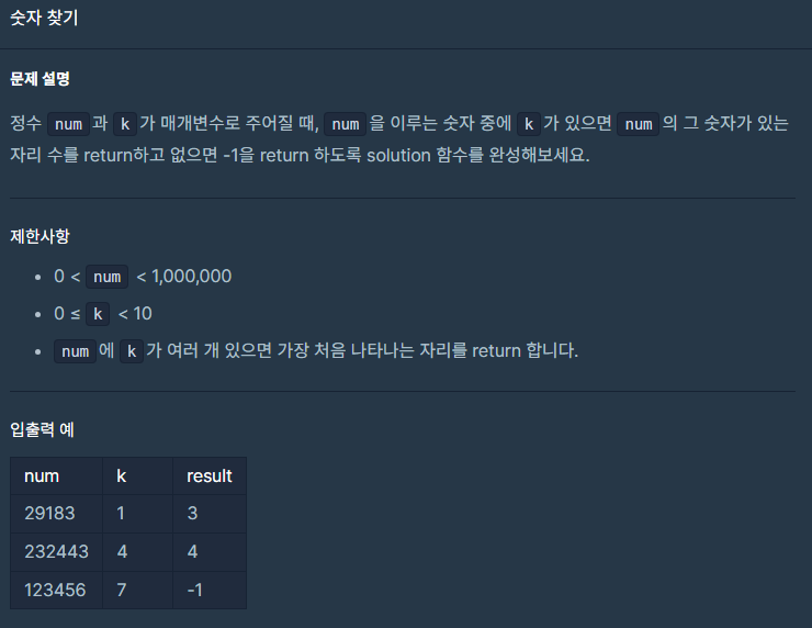 기본값을 -1로 설정해 줬다. 그리고 num을 string으로 변경해 주고 그 길이만큼 for문으로 돌렸다. 각 수중 k와 같은 값이 있으면 answer에 i+! 을 해주고 answer를 리턴하였다.(char)(k+'0')을 해준 이유는 k는 int형이니 문자형으로 바꾸고 '0'을 더해서 비교가 가능하도록 했다.
