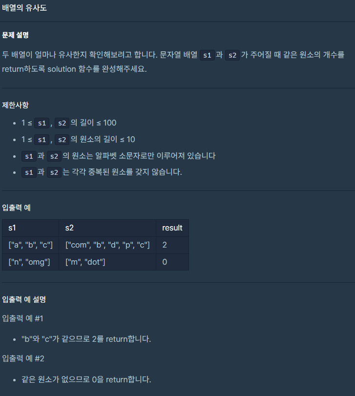 간단한 문제였다. s1와 s2를 모두 돌며 같은 수가 있으면 answer에 ++를 해주고 반환하였다.