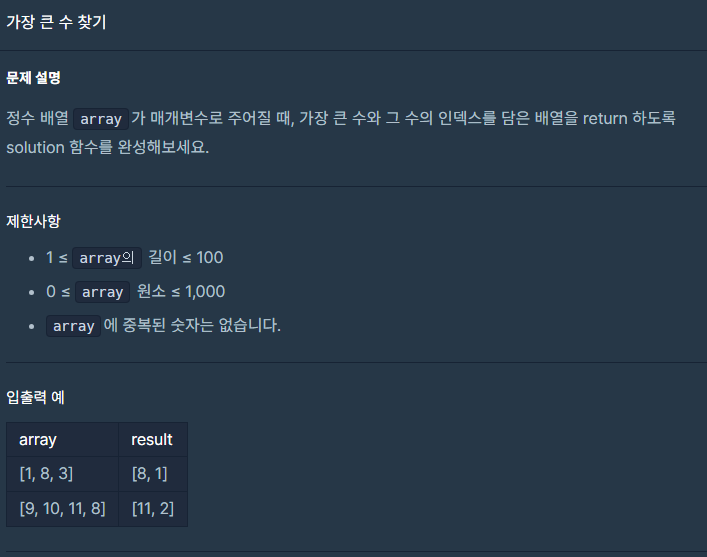 크기를 비교해야 하기 때문에 0번째엔 array의 첫 값, 1번째엔 현재원소위치를 대입 후 for문으로 비교를 해줬다. array [i]가 max보다 크면 max값을 교환해 줬다. 그 후 반환해 줬다.