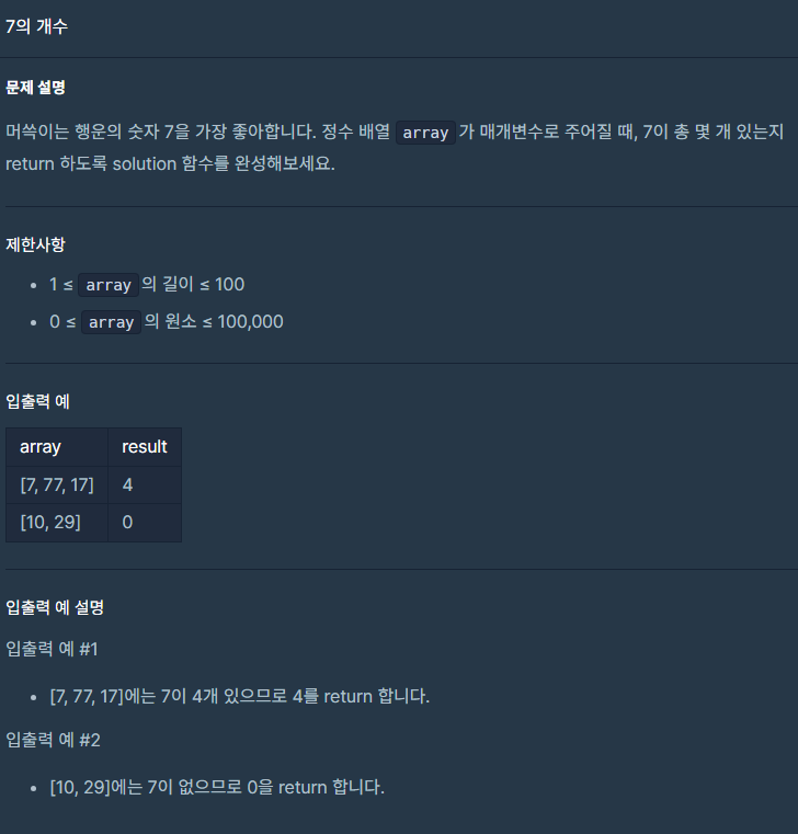 배열의 길이만큼 for문을 사용했다. 안에서는 while문을 사용해서 0보다 작을 때까지 반복하고 array [i]에 담긴 값을 10으로 나눠서 나머지가 7일 때 answer++를 해줬다. 그 뒤 나누기 10을 해준 값을 다시 대입해 주고 answer값을 반환하였다.