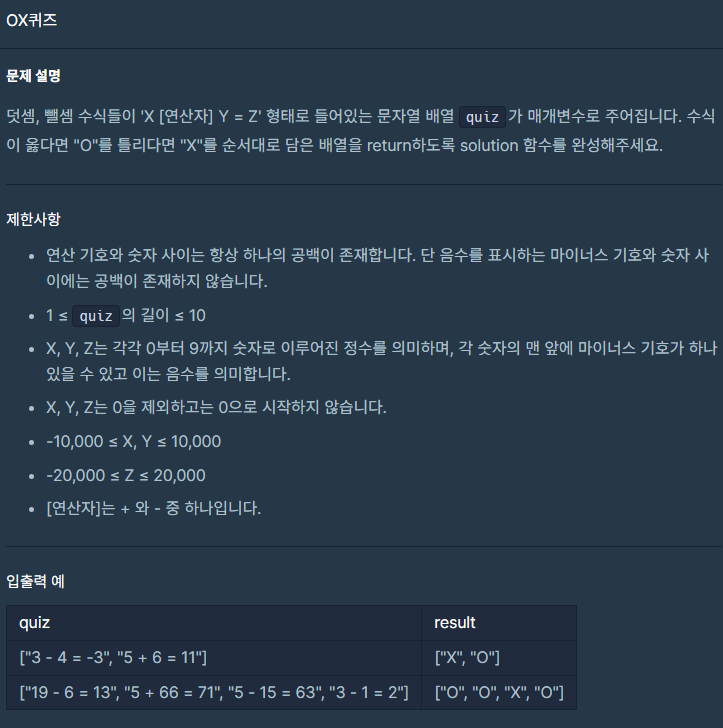 quiz크기만큼 배열을 하나 생성했다. 그 뒤 배열길이만큼 for문을 반복해 줬고 result에 공백기준으로 잘라서 넣어줬다. 0번째엔 숫자, 1번째엔 기호, 2번째엔 숫자, 4번째엔 결괏값이 들어가 있을 것이다. 그래서 각각 저장해 준 뒤 1번째 값인 기호가 +이면 opInt에 더해주고 아니면 차를 구했다. 그 뒤 아래 fi문에서 값이 같으면 O를 대입, 다르면 X를 대입하고 반환했다.