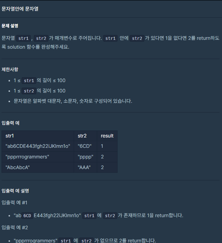contains을 써서 포함되는지 안되는지 확인한 뒤 포함되면 1, 포함되지 않으면 2를 넣고 반환했다.