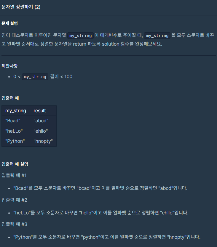 for문으로 my_string의 길이만큼 반복해 줬다. char형 변수 ch에 각 원소들을 넣어주고 이 값이 대문자이면 소문자로 변경한 뒤에 result에 대입해 줬다. 반복문이 종료되면 정렬을 해야 되기 때문에 char형 배열 answer를 생성하고 result로 초기화해 줬다. 그 뒤 Arrays.sort()를 사용해서 오름차순으로 정렬한 뒤 String형으로 변경해서 반환하였다.