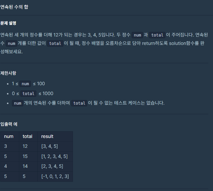 answer은 num의 개수만큼 선언해줬다. 그 뒤 startNum을 지정하여 초기화해 줬다. 연결된 값의 평균을 구하기 위해 total / num을 해줬고 거기서 중간값을 빼줬다. 만약 num이 짝수이면 중간값이 없기 때문에 +1을 해줬다. 그 뒤 for문으로 answer [i]에 중간값부터 차례대로 넣어주고 반환하였다.
