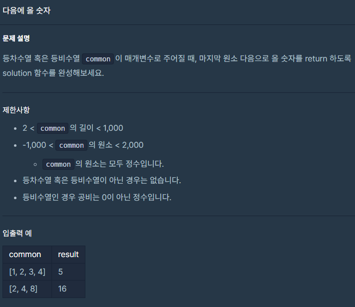 등차인지 등비인지는 각 값의 차가 일정한지 커지는지 체크하면 됐다. 그래서 첫 번째 if에서 원소들의 차가 같으면 등차수열이므로 answer에는 마지막 값 + 원소의 차이를 더해줬다. 만약 등비수열이라면 마지막 값 * (원소끼리의 배율)을 해줬다. 처음에는 마지막값 * (원소의 차이)로 했는데 실패했다. 1 2 4를 예로 들어봤더니 실패했다. 그래서 / 로 배율을 구해서 곱해줬다.