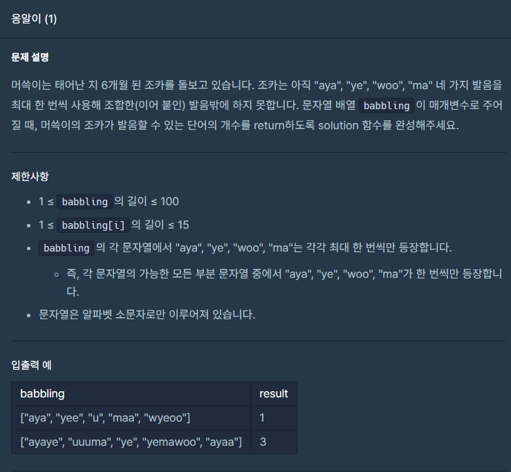 어떻게 할까 고민을 했다. 해결에 도움이 될만한 함수를 찾아보다가 spring에서 사용했던 정규식이 있었다. 우선 for문으로 babbling의 길이만큼 반복시켜 줬다. 그 뒤 check에 문자열을 하나씩 넣어주고, matches()을 사용해서 정규식과 한번 이상 일치하는지 확인했다. 이 문제는 얼떨결에 해결됐다. 체크해 두고 다시 한번 풀어봐야 될 문제 같다. 의문이다.