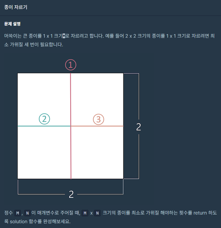 M을 가로 N을 세로의 길이라고 생각하고 풀이를 하였다. M에서 -1을 해주면 세로로 잘라야하는 가위질의 횟수, n에서 -1을 해주면 가로로 잘라야 하는 횟수가 나온다. M을 곱해준 이유는 세로로 잘린 종이만큼 가로로 잘라줘야 하기 때문에 곱해줬다. 이 횟수를 더해서 반환했다. 머리 아플 뻔했던 문제였다.